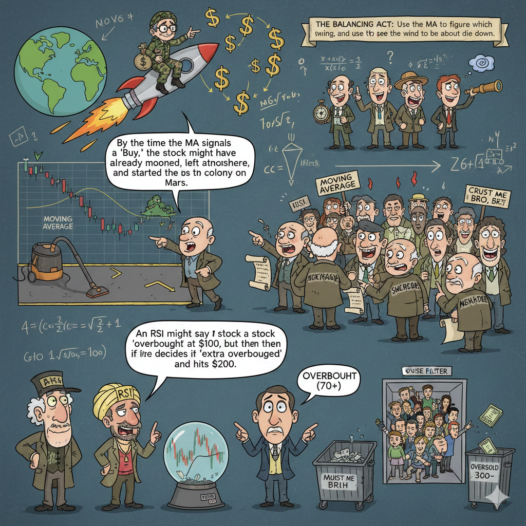 Why use them? Because prices are noisy. Without a moving average, a stock chart looks like a seismograph during a dinosaur stampede. The MA filters the noise. If the price is above the line, things are generally “good.” If it’s below, you might want to start updating your resume. The downside? By the time the MA signals a “Buy,” the stock might have already mooned, left the atmosphere, and started a colony on Mars.
