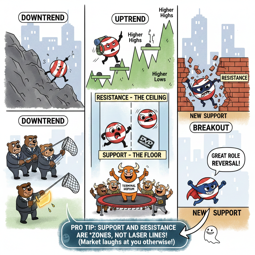 Feature Support Resistance Analogy The Floor / Trampoline The Ceiling / Brick Wall Trader Action Buyers step in Sellers take profit Breakout Result Becomes New Resistance Becomes New Support Pro Tip: Support and resistance are zones, not laser-thin lines. Treating them like exact numbers is a great way to get “stopped out” while the market laughs at you.